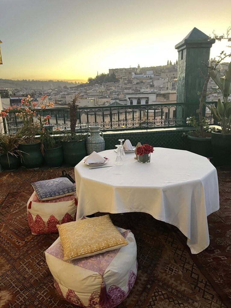 A private sunset tea overlooking Fez, with the city glowing below