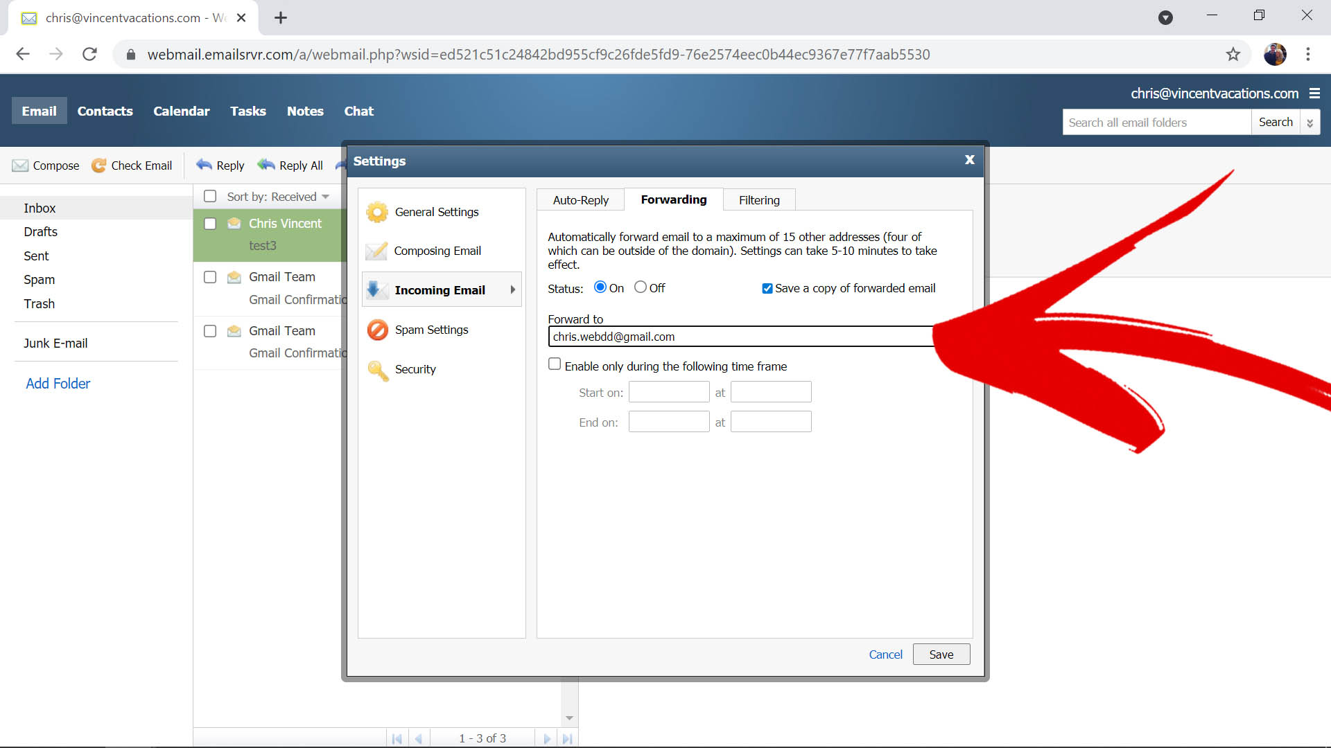 How to automatically forward new emails sent to your Vincent Vacations email address to Gmail